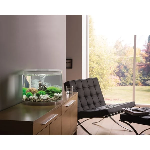 Das Aquarium biOrb TUBE 35 LED weiß kommt vollständig ohne Ränder und Leisten aus. Bei einem Durchmesser von 41 cm und 36,9 cm Höhe hat es ein Fassungsvermögen von 35 Litern. Es ermöglicht einen 360 Grad Rundum-Blick in das beleuchtete Becken. Zum Komplettset gehören neben dem Acrylaquarium eine langlebige LED-Lichteinheit, eine Aquarienpumpe, ein Transformator, ein Ausströmerstein, Bodengrund aus Keramik sowie eine Filterkartusche. Das patentierte Filtersystem ist im Sockel des Aquariums verborgen. Die Kombination aus biologischer, chemischer und mechanischer Filterung macht aus dem biOrb ein vollständig gefiltertes Aquarium. Dank der Aquarienscheiben aus Acryl ist das biOrb TUBE 15 LED weiß besonders stabil und widerstandsfähig. Die Acrylwände sind sehr leicht und dank der hohen Transparenz des Materials (93 %) besonders durchsichtig. Wir empfehlen für dieses Aquarium den Tierbesatz auf kleine Garnelen und/oder Schnecken zu beschränken!