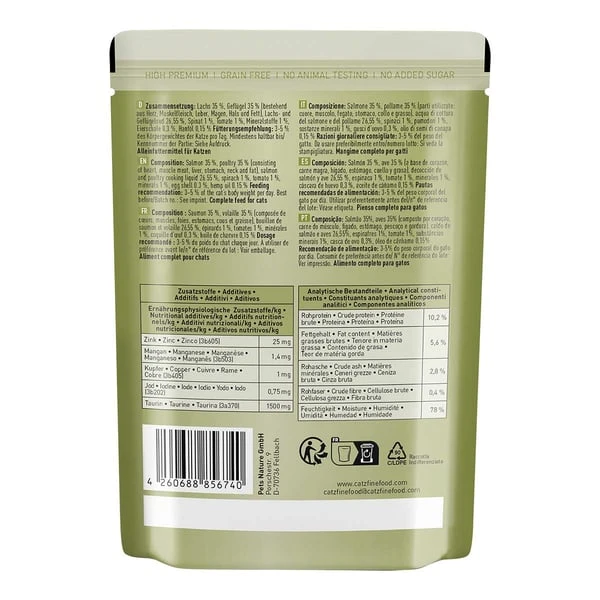 Lachs 35%, Geflügel* 35% (bestehend aus Herz, Muskelfleisch, Leber, Magen, Hals und Fett), Lachs- und Geflügelsud 26,55%, Spinat 1%, Tomate 1%, Mineralstoffe 1%, Eierschale 0,3%, Hanföl 0,15%