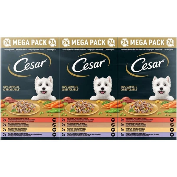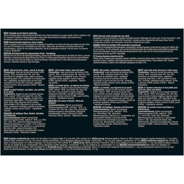 mit saftigem Rind, Nudeln, Karotten und Petersilie – Zusammensetzung: Fleisch und tierische Nebenerzeugnisse (43%, natürlich* 92%, u.a. Rind 4%, Leber 4%), pflanzliche Nebenerzeugnisse, Bäckereierzeugnisse (u.a. Nudeln 1.2%, entspricht gekochten Nudeln 4%), Gemüse (u.a. getrocknete Karotten 0.6%, entspricht Karotten 4%), Mineralstoffe, pflanzliche Eiweißextrakte, Kräuter (Petersilie 0.02%). * Natürliche Zutaten. # mit zartem Truthahn, Rind und Kräutern – Zusammensetzung: Fleisch und tierische Nebenerzeugnisse (43%, natürlich* 92%, u.a. Truthahn 4%, Rind 4%, Leber 4%), pflanzliche Nebenerzeugnisse, Mineralstoffe, pflanzliche Eiweißextrakte, Kräuter (Rosmarin 0.08%, Petersilie 0.02%), Gemüse. * Natürliche Zutaten. # mit Geflügel, Gemüse und Petersilie – Zusammensetzung: Fleisch und tierische Nebenerzeugnisse (43%, natürlich* 92%, u.a. Hühnerleber 4%), pflanzliche Nebenerzeugnisse, Gemüse (u.a. Kombination aus getrockneten Karotten und Erbsen 0.8%, entspricht einer Kombination aus Karotten und Erbsen 4%), Mineralstoffe, pflanzliche Eiweißextrakte, Kräuter (Petersilie 0.02%). * Natürliche Zutaten. # mit zartem Lamm und Erbsen in Kräutersauce – Zusammensetzung: Fleisch und tierische Nebenerzeugnisse (43%, natürlich* 92%, u.a. Lamm 4%, Leber 4%), pflanzliche Nebenerzeugnisse, Gemüse (u.a. getrocknete Erbsen 1.2%, das entspricht Erbsen 4%), Mineralstoffe, pflanzliche Eiweißextrakte, Kräuter (Rosmarin 0.08%, Petersilie 0.02%). * Natürliche Zutaten.
