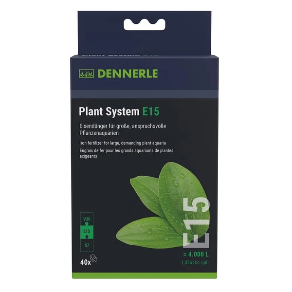 Mit steigender Aquariengröße erhöht sich auch die Menge und Größe der Pflanzen. Aus diesem Grund haben wir unser Plant System entwickelt, ein System mit hochkonzentrierten Komponenten. Die Komponenten Plant System V30 (Volldünger), <Plant System S7 (Vitalstoffe) und Plant System E15 (Eisendünger) sind daher auf die Bedürfnisse von großen Aquarien ausgelegt. Es werden so alle Makro- und Mikronährstoffe und Spurenelemente abgedeckt. Plant System E15 versorgt alle Aquarienpflanzen mit sofort wirksamem, 2-wertigem Nähreisen und sorgt so für frisches, prachtvolles Grün. Mangelsymptome wie gelbe, glasige Blätter werden weitestgehend geheilt, junge Blätter treiben wieder sattgrün. Eisen ist für alle Aquarienpflanzen von zentraler Bedeutung. Es wird für die Bildung des lebenswichtigen Blattgrüns benötigt. Ohne Blattgrün kann die Pflanze keine Photosynthese betreiben. Eisenmangel zeigt sich sofort: Die jungen Blätter erscheinen blass und gelblich (Eisenchlorose). Wichtig zu wissen: Pflanzen können nur sogenanntes 2-wertiges Eisen aufnehmen. Dieses ist leider im Aquarium nicht stabil, sondern wird schnell oxidiert und dadurch zu unwirksamem 3-wertigen, „braunen“ Eisen umgewandelt. Leitungswasser enthält praktisch kein Eisen. Aquarienpflanzen sind deshalb auf regelmäßige Eisendüngung angewiesen. Spezielle Schutzhüllen – sogenannte Chelate – schützen das E15-Eisen wirksam und halten es im Aquarium lange pflanzenverfügbar (Depotwirkung). E15 ist phosphat- und nitratfrei und deshalb nicht algenfördernd.