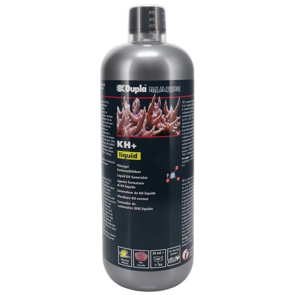 Dupla Marin KH+ liquid fördert das Wachstum aller kalkbedürftigen Organismen wie Steinkorallen, Kalkröhrenwürmer, Muscheln und verschiedener Kalkrotalgen. Für Dosierpumpen geeignet. Enthält 5.000° dKH 1.000 mg K. Die Hauptelemente Hydrogencarbonate (HCO3), Calcium (Ca) und Magnesium (Mg) beeinflussen entscheidend die Wasserstabilität (ph-Wert, Alkalinität / Karbonathärte) im Riffaquarium. Die KH / Alkalinität sollte im Meerwasseraquarium zwischen KH 7 und KH 9 °dH liegen und ist entscheidend für die Pufferkapazität im Meerwasser. KH+ liquid erhöht zuverlässig die Karbonathärte und puffert den pH-Wert im Meerwasseraquarium ab. Karbonate werden von vielen kalkzehrenden Organsimen wie Steinkorallen, Muscheln, Kalkröhrenwürmer, verschiedenen Kalkrotalgen sowie durch biogene Entkalkung ständig verbraucht. Hohe pH-Schwankungen und eine Unterversorgung aller kalkbildenden Organismen werden durch regelmäßige Zugabe verhindert. Enthält zusätzlich das Spurenelement Kalium. Dosierung: 20 ml erhöhen die Karbonathärte /Alkalinität um 1 °dKH / je 100 l.