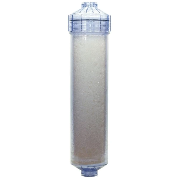 Filtergehäuse gefüllt mit 500 ml Duresin SI. Wird einer Osmoseanlage nachgeschaltet. Inklusive Schlauchanschlüssen für Osmoseanlagen. 500 ml Filtervolumen binden bis zu 5.000 mg Silikat.