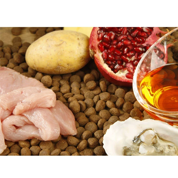 Geflügelfleisch (38%, getrocknet und fein vermahlen, davon 70% Pute), Kartoffelflocken (aufgeschlossen), Kartoffelstärke (fein vermahlen), Granatapfelkerne (7%), Geflügelfett, Lachsöl (1%), Lignozellulose, Mineralstoffe, Bierhefe, Chicoree (0,5%, fein vermahlen, FOS und Inulin), Spirulina (0,1%, fein vermahlen), neuseeländische Grünlippmuschel (0,1%, fein vermahlen, von Natur aus reich an Glucosaminen und Chondroitin), Yucca schidigera.