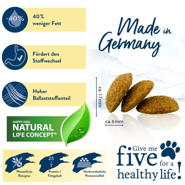 Tierische Proteine* (16% Geflügel, 4% Lamm), Mais, Maismehl, Reismehl, Gerste, Lignocellulose, Fischmehl (5%, davon 50% Lachsmehl), Grieben, Leberhydrolisat, Rübenmelasseschnitzel* (entzuckert), Geflügelfett, Apfeltrester*, Kaliumchlorid, Sonnenblumenöl, Hefe*, Natriumchlorid, Meeresalgen*, Leinsamen (0,15%), Trockenvollei (0,1%), Rapsöl, Muschelfleisch* (0,02%), Hefe* (extrahiert), Mariendistel, Artischocke, Löwenzahn, Ingwer (0,013%), Birkenblätter, Brennnessel, Kamille, Koriander, Rosmarin, Salbei, Süßholzwurzel, Thymian, (Trockenkräuter gesamt 0,15%); *) getrocknet