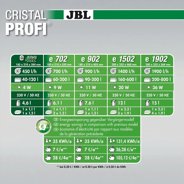 Mit nur 20 W Stromverbrauch bietet der CristalProfi e1502 eine hohe Energieersparnis. Bei gleichbleibender effektiver Wasserumwälzung verbraucht das Gerät 27 % weniger Strom als vergleichbare Vorgängermodelle. Der patentierte Schlauchanschlussblock mit Sicherheitsventil verhindert den Austritt von Wasser beim Abkoppeln des Filters. JBL CristalProfi ist TÜV geprüft.