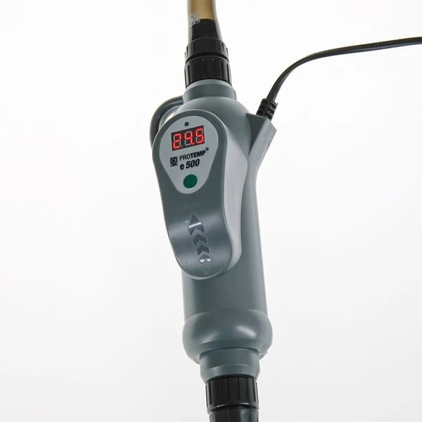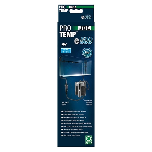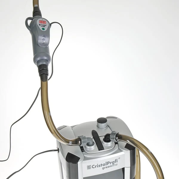Modell e500: 1 Durchlaufheizer 500 W für Aquarien von 160-600 l (100-150 cm) mit Schlauchanschlüssen für 12/16, 16/22 und 19/25 mm und Reinigungsbürste.