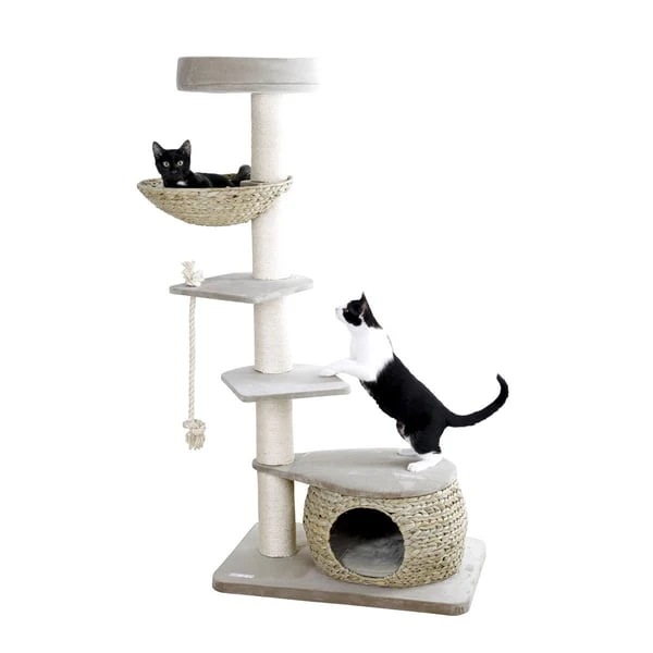 Besonders kuschelig ist der Kratzbaum mit dem eingearbeiteten Plüsch. Mit dem widerstandsfähigen Sisal trotzt der Kratzbaum auch ausdauerndem Kratzen. Eine besonders schöne und natürliche Optik bekommt der Kratzbaum mit den verwendeten Bananenblättern. Hier kann sich deine Katze nicht nur austoben, sondern auch zum Ausspannen zurückziehen. Auch mehrere Katzen können sich dank der großen Stabilität des Kratzbaums austoben. Nicht nur ein toller Ort um die Krallen auf Vordermann zu bringen, sondern auch zum Klettern und Spielen. Besonders robust und strapazierfähig gefertigt. Mit einer Höhle für mehr Gemütlichkeit, mehreren Etagen zum Klettern, Extras für viel Spielspaß, einer bequemen Liegemulde, extra dicken Stämmen für lange Kratz-Sessions, einem herausnehmbaren Kissen ist der Kratzbaum wunderbar ausgestattet. Mit dem Kratzbaum von Kerbl lässt du es deiner Katze gut gehen.