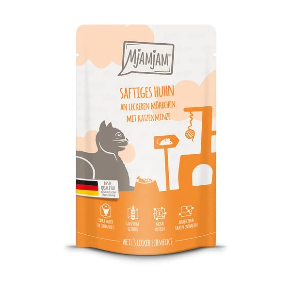 Hühnerfleisch, -leber, -herzen (72,5%), Fleischbrühe (22,4%), Möhrchen (4%), Mineralstoffe (1%), Katzenminze (0,1%)