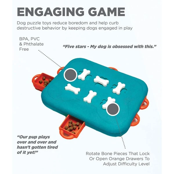 Das interaktive Denkspielzeug Dog Casino von Nina Ottosson by Outward Hound ist ein Hundespielzeug mit Level 3 für Fortgeschrittene und ideal geeignet für gelangweilte Hunde. Dieses interaktive Spielzeug hat sechs Schubfächer für Hundeleckerlis, die durch Drehen der Riegel in Knochen-Form geöffnet werden können. Platziere einfach die Leckerlis in den Schubfächern, schiebe sie hinein und drehe die Knochen, um deinen Hund mit der Bewältigung eines zusätzlichen Schrittes herauszufordern. Dein Liebling wird viel Spaß dabei haben, das Spielzeug mit seinen Pfoten zu verschieben und daran zu schnüffeln, um an die versteckten köstlichen Leckerlis zu gelangen.