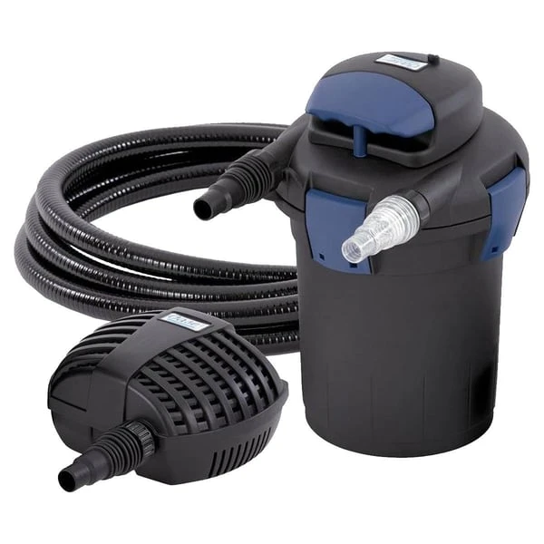 An den Filter, fertig, los: Das BioPress Set 10000 ist ideal für jeden Start Up – Teichbesitzer, denn das Komplettset inkl. 5 m Schlauch ist ganz einfach eingebaut und angeschlossen. Es zeichnet sich besonders durch seine effektive Filterleistung aus, denn die im Set enthaltene 70 Watt Filterpumpe, der Druckfilter und das darin integrierte 11 Watt UVC-Vorklärgerät sind perfekt aufeinander abgestimmt. Teiche bis zu 10 m³ (bei Fischbesatz bis zu 5 m³) erhalten garantiert klares Wasser, das sogar zu einem höher gelegenen Bachlauf befördert werden kann. Verschmutztes Wasser wird mit einer Leistung von 3400 l/h zum Filter transportiert. Seine einfache, patentierte Handhabung überzeugt, denn Ihre Hände bleiben sauber beim Reinigen der Filterschwämme, deren Verschmutzung sogar außen angezeigt wird. Und damit keiner den Filter sehen kann, lässt der sich fast komplett eingraben. Vertrauen Sie auf OASE-Qualität: Sie erhalten 2 Jahre Garantie plus eine Klarwassergarantie.