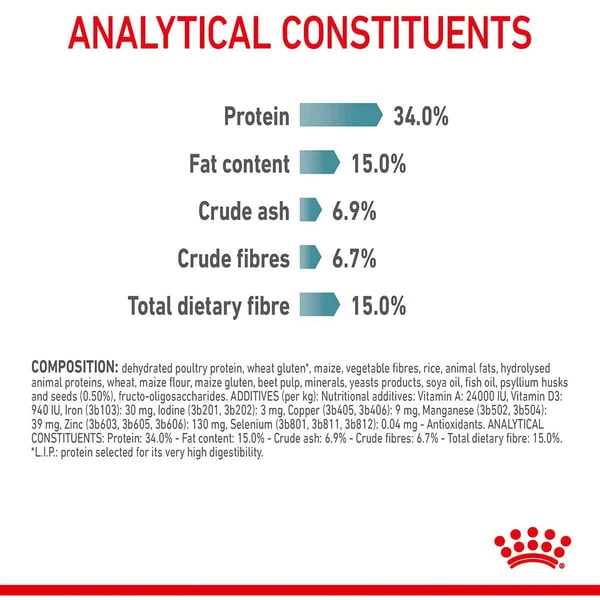 Geflügelprotein getrocknet, Weizenkleber*, Mais, pflanzliche Fasern, Reis, Tierfett, hydrolysierte Tierproteine, Weizen, Maismehl, Maiskleber, Rübenschnitzel, Mineralstoffe, Hefenerzeugnisse, Sojaöl, Fischöl, Psyllium (Schalen und Samen; 0,50%), Fructo-Oligosaccharide