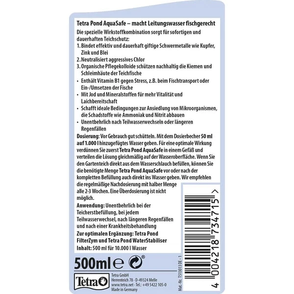 Anwendung: Unentbehrlich bei der Teicherstbefüllung, bei jedem Teilwasserwechsel, nach längeren Regenfällen und nach einer Krankheitsbehandlung Dosieranleitung: Flasche vor Gebrauch gut schütteln. Mit dem Dosierbecher 50ml Tetra Pond AquaSafe auf je 1.000 Liter Teichwasser geben. Für optimale Wirkung Tetra Pond AquaSafe in einem Behälter vorverdünnen und großflächig auf der Wasseroberfläche verteilen. Wir empfehlen die regelmäßige Nachdosierung mit halber Menge alle 2-3 Wochen. Eine Überdosierung ist nicht möglich