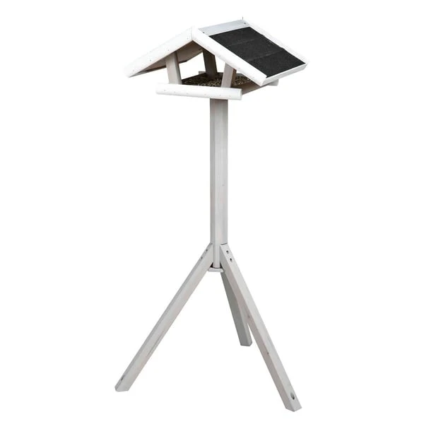 Dieses grau/weiße Vogelfutterhaus ist ein Hingucker. Es ist rundherum offen, hat eine große Fläche zum einfachen und großzügigen Bestreuen mit Vogelfutter und bietet den frei lebenden Vögeln umfangreiche Landemöglichkeiten – auch auf dem Dach. Das Futterhaus besteht aus hochwertigem Kiefernholz. Dieses ist mit einer speziellen Lasur behandelt und somit winter- und wetterfest. Der großflächige, schützende Dachüberstand hält das Futter trocken.