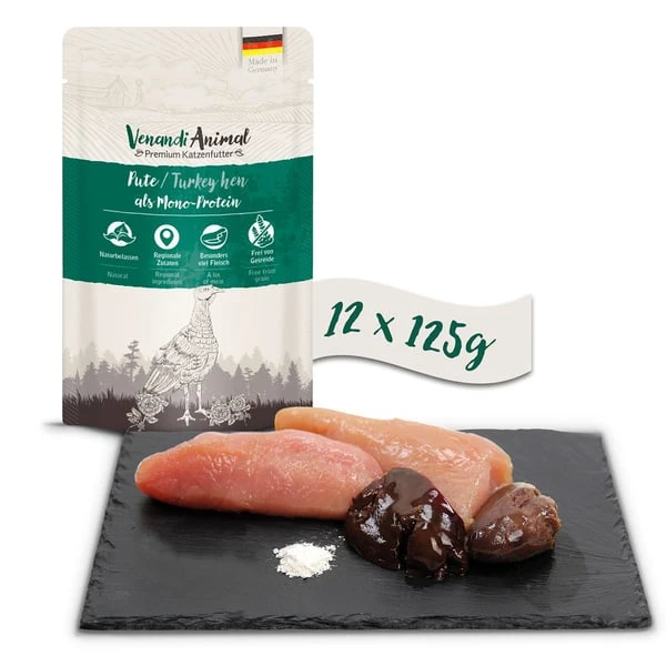 Putenfleisch, -herz, -leber, -muskelmagen 71 %, Fleischbrühe 28 %, Mineralstoffe 0,5 %, Eierschalen (getrocknet) 0,5 %.