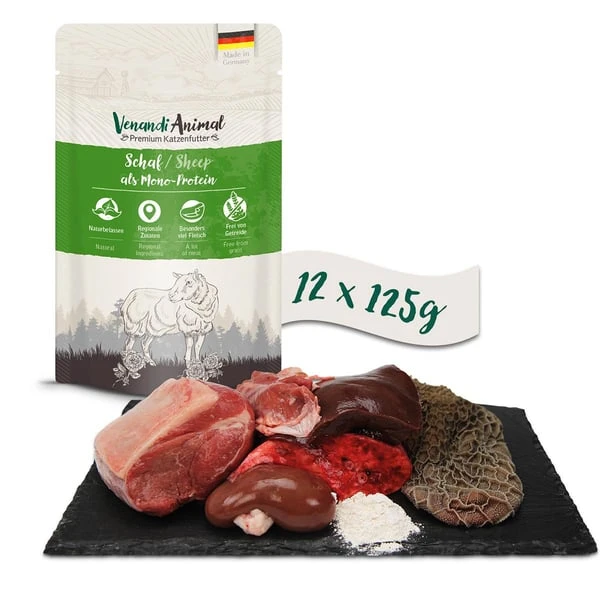 Schafsfleisch, -herz, -leber, -lunge, -niere, -pansen 71 %, Fleischbrühe 28 %, Mineralstoffe 0,5 %, Eierschalen (getrocknet) 0,5 %.