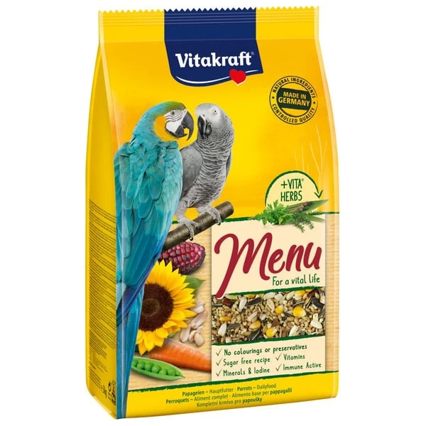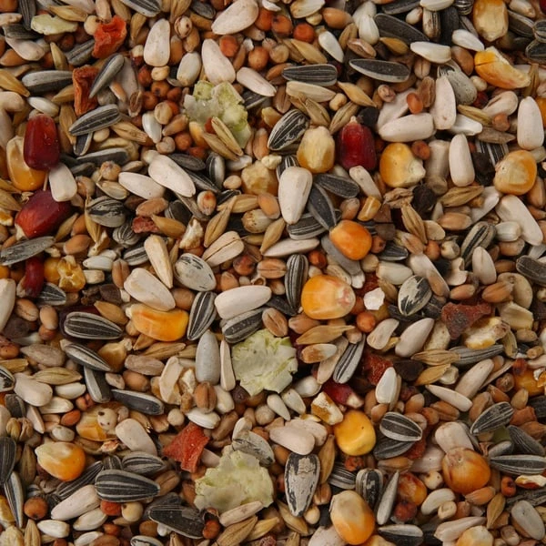 Getreide 65,9% (Roter Mais 4%), Saaten 27,7%, Mineralstoffe, Gemüse (Karotten, getrocknet 1%), Nüsse, Pflanzliche Nebenerzeugnisse, Honig 0,02%, Öle und Fette, Hefen (Beta Glucane 80mg/kg)